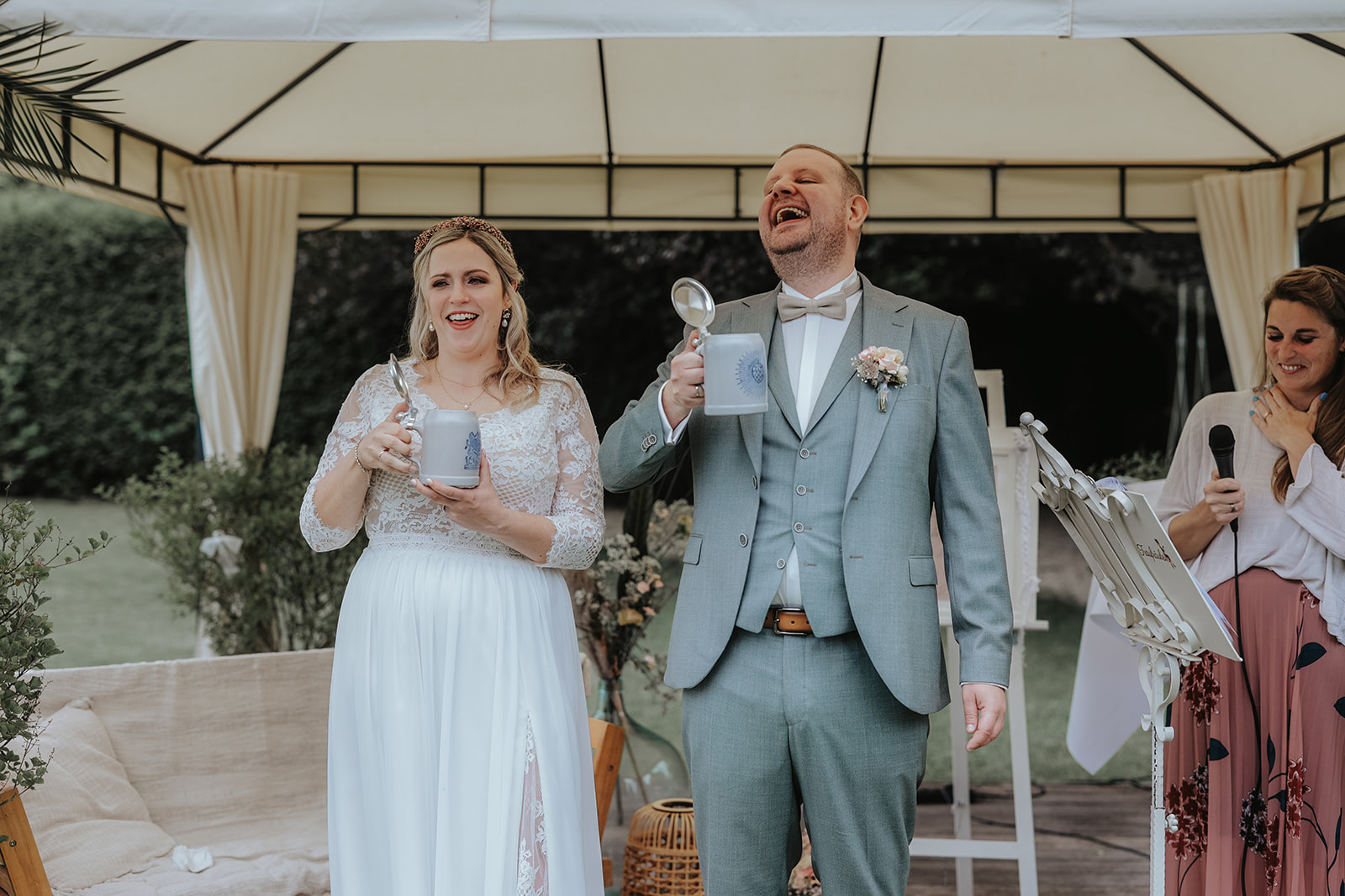Allerdings haben sie sich ja mit dem Ja-Wort nur kurz vorher das Versprechen gegeben, sich auch zukünftig jeder neuen Situation gemeinsam zu stellen und diese zu meistern. Das „Mischbier-Ritual“ war demnach die erste Herausforderung, welcher sie sich gemeinsam gestellt haben. Das Bier wurde gemischt und dann wurde von drei runtergezählt und mit der ganzen Hochzeitsgesellschaft angestoßen! Und obwohl der Gesichtsausdruck auf den Bildern vermuten lässt, dass es nicht unbedingt lecker war, haben beide im Anschluss zugegeben, dass es weniger schlimm als vermutet geschmeckt hat.